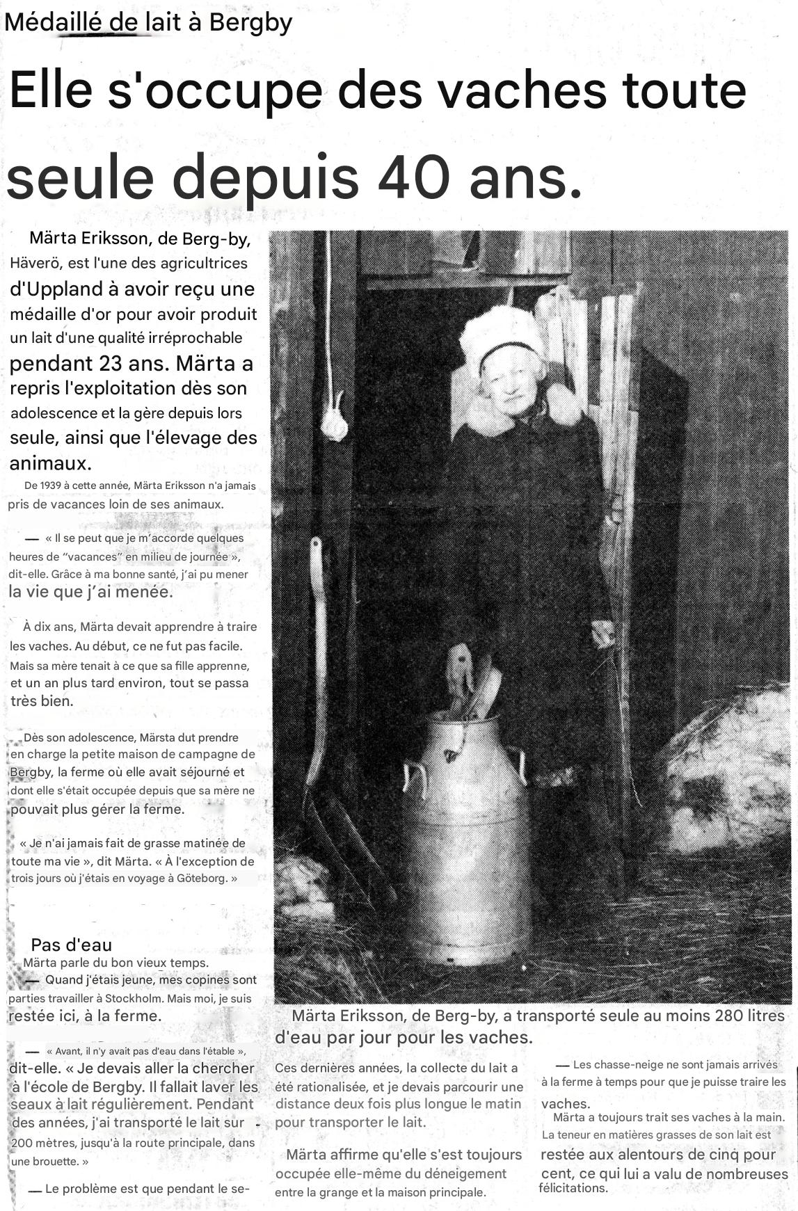 La vache laitière est l’animal domestique le plus important : elle fournit de la viande, mais surtout du lait, aliment essentiel à une époque sans réfrigérateur. Autrefois, presque toutes les fermes, même les plus petites, possédaient au moins une vache et quelques poules pour assurer leur autosuffisance. Certaines exploitations plus importantes permettent un élevage plus extensif ; par exemple, Norrbygård compte une trentaine de vaches laitières. Après la Seconde Guerre mondiale, l’agriculture se développe rapidement. Les agriculteurs commencent à investir dans des machines à traire et des tracteurs, mais les méthodes de travail manuelles traditionnelles restent pratiquées dans nos villages jusque dans les années 1950. La vache laitière est un pilier de l’agriculture et une source de revenus importante pour de nombreuses exploitations. En 1979, Märta Olsson, de la ferme située derrière l’école de Bergby, reçoit une médaille d’or pour avoir produit un lait d’une qualité irréprochable pendant 23 ans. De 1939 à 1979, elle ne s’est jamais accordée de vacances et transportait seule au moins 280 litres d’eau par jour pour ses vaches.